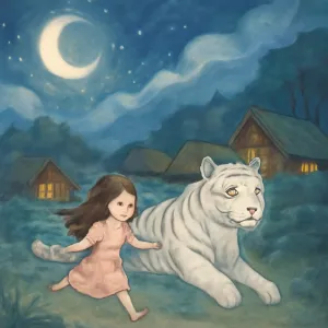 이 꿈에서 옛날 느낌의 나무집들, 그리고 백호가 등장하여 소녀와 손을 잡고 도망가는 장면은 매우 강한 상징성을 지니고 있습니다.