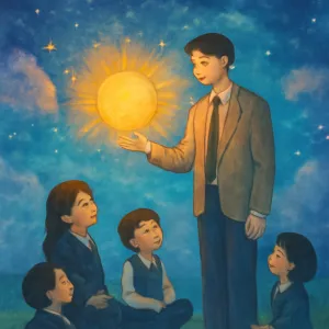 특히, 그 선생님이 태양을 손에 직접 넣는 장면은 매우 강렬한 상징으로, '권력과 에너지의 통제', '밝음과 깨달음의 획득', 혹은 '자신감과 영향력 확대'의 의미로 해석될 수 있습니다.
