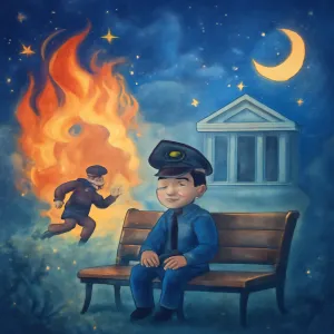 이 꿈에는 경찰, 화재방화범 체포, 그리고 법원 앞 공원 벤치에서 대화라는 세 가지 중요한 장면이 등장합니다.