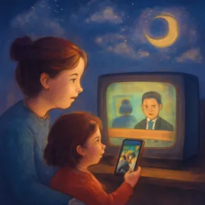 엄마와 함께 뉴스를 보는 장면은 가족과의 관계 혹은 신뢰하는 관계에서 얻는 정보와 관련이 깊으며, '우리 동네에 범죄자가 나왔다'는 내용은 안전과 신뢰가 위협받는 상황을 반영할 수 있습니다.