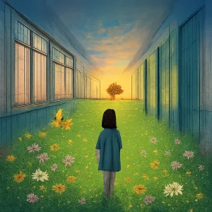 하지만 이 교실 복도가 평범한 복도가 아니라 잔디와 꽃으로 뒤덮여 있는 자연의 공간으로 변해 있고, 노란 나비가 날아다니며 혼자 있는 상황은 매우 특별한 상징을 담고 있습니다.