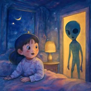 할머니 집이라는 가족과 관련된 공간에서 파자마 파티처럼 친근하고 따뜻한 분위기를 기대했으나, 갑작스러운 외계인의 등장과 두려움은 꿈에서 자주 나타나는 상징적 모티프입니다.