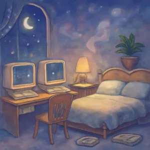 특히 컴퓨터, 화분, 게임기와 같이 일상에서 자주 접하는 물건들이 두 개씩 존재하는 모습은 현실과 내면의 대비, 혹은 변화된 시각을 상징할 수 있어요.