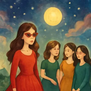 빨간 선글라스는 그녀가 자신을 보호하거나 자신의 감정을 감추려는 태도, 또는 현실과 자신의 모습을 다르게 보고 싶어 하는 심리적 방어 메커니즘을 나타낼 수 있습니다.