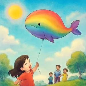 꿈속에서 무지개 색의 커다란 고래 풍선이 밝은 하늘 위로 떠오르는 모습을 가족과 함께 바라본다는 것은 정말 특별하고 아름다운 경험입니다.