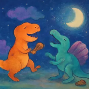 당신의 꿈에서 티라노사우루스가 등장하여 댄스를 추며 닭다리를 먹고, 강력한 상대인 스피노사우루스를 죽인 뒤에 똥을 지리는 장면은 매우 독특하면서도 다층적인 상징을 내포하고 있습니다.