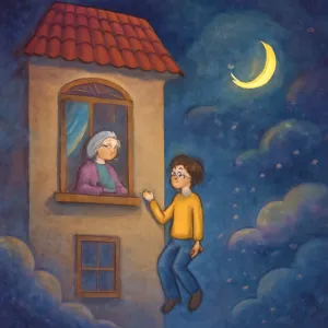 할머니 집이라는 가족의 안식처와 친숙한 공간, 네 개의 층 높이에서 창문에 아슬아슬하게 매달린 모습은 꿈 속에서 불안감, 위험, 그리고 변화에 대한 두려움을 강하게 나타냅니다.