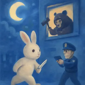 - 창문 너머 곰이 망치를 들고 폭력적으로 행동하는 모습은 큰 규모의 문제나 두려움, 위협을 상징할 수 있습니다.