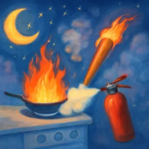 여기서 후라이팬에서 불이 나는 장면은 갑작스러운 문제나 긴급 상황, 내면의 감정적 폭발을 나타낼 수 있습니다.