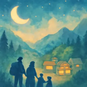 가족과 산으로 피난 가는 모습은 보호와 안전을 추구하는 심리를 나타내며, 자연 속의 산은 전통적으로 안정, 고요함, 재생의 상징입니다.