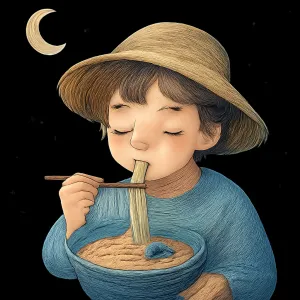 모래가 묻었음에도 국수를 계속 먹는 모습은, 작지만 신경 쓰이는 문제를 인내하며 극복하** 하는 자신감과 내면의 강함을 상징합니다.