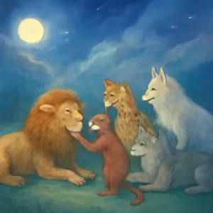 사자가 원숭이에게 부드럽게 다가가고 몸을 비비는 모습은 우정, 수용, 보호와 신뢰를 나타냅니다.