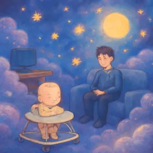 갓난아기와 보행기는 새로운 시작, 성장, 책임감을 나타내며, 사무실은 직장, 업무, 사회적 역할을 상징합니다.
