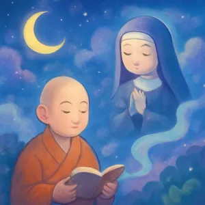 많은 문화권에서 스님과 여승은 명상, 마음의 안정, 그리고 행복과 진리에 대한 길을 상징하며, 경 읽기는 이러한 정신적 가치를 더욱 강화하는 메시지로 해석됩니다.