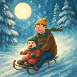 빠르게 썰매를 타는 즐거움은 인생 여정에서 경험하는 스릴과 성장, 가족과의 조화로운 시간을 상징합니다.