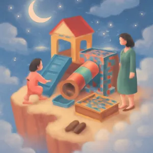 절벽과 하늘은 종종 자유, 불안, 도전, 또는 삶의 중요한 변화를 상징하며, 놀이시설과 신발의 상징은 어린 시절의 순수성, 안전, 그리고 자신감과 연관됩니다.
