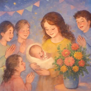 이 꿈은 출산 꿈, 새로운 시작, 축하 잔치, 아기 탄생, 꽃다발 선물과 같은 중요한 키워드를 통해, 삶의 긍정적 변화와 성장에 관한 깊은 메시지를 담고 있습니다.