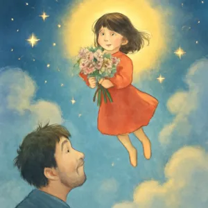 꽃다발을 들고 하늘로 올라간 모습은 자녀의 성공, 영적 성장, 혹은 삶의 새로운 가능성을 축복하는 마음을 상징합니다.
