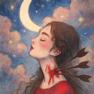 여기서 화살은 흔히 위협, 상처, 또는 갈등을 상징하며, 특히 목은 의사소통, 진실의 표현, 또는 자아와 타인의 연결을 의미하는 부위로 해석됩니다.
