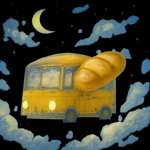 노란색 버스 안에서 빵을 꺼내오는 당신의 꿈은 ‘여정 중에도 따뜻함과 희망을 잃지 말라’는 부드러운 메시지처럼 느껴집니다.