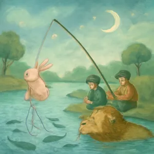 긴 낚시대와 줄, 그리고 토끼를 미끼로 사용하는 모습은 독특하면서도 강한 상징성을 담고 있는데요, 이는 희귀한 기회 또는 강력한 도구를 활용해 원하는 것을 성취하려는 의지를 나타냅니다.