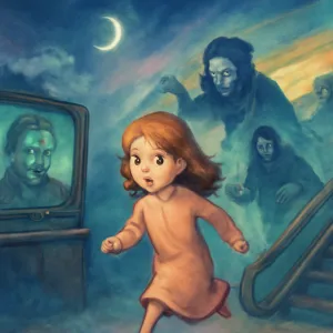 텔레비전 속 인물들이 갑자기 좀비로 변해 현실로 나오고 도망치는 상황은 두려움, 통제 상실, 그리고 현실에서 벗어나고 싶은 욕구를 반영합니다.