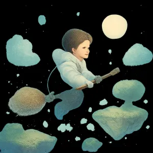 이 힘든 환경에서 벗어나기 위해 하얀 패딩을 입고 빗자루를 타고 도망치는 모습은 자유를 향한 갈망과 탈출의 여정을 나타냅니다.