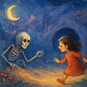 특히 해골이 모래놀이를 하다가 친근하게 손짓하는 모습은 그 어두운 상징 속에서도 친밀감이나 소통의 가능성을 암시합니다.