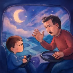 두 사람이 각각 다른 핸들을 잡고 운전하는 상황은 본인의 삶과 아버지와의 관계, 그리고 책임감이나 통제력에 대한 내면의 갈등을 상징할 수 있습니다.