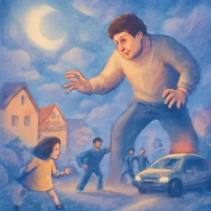 이어서 꿈의 배경은 익숙한 내 동네 환경이며, 긴장감이 흐르는 상황 속에서 위협적인 3미터 크기의 거인이 등장하여 나를 추격합니다.