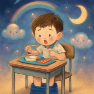 학교에서 급식을 먹고 있는 상황은 흔히 성장, 사회적 관계, 일상 생활의 규칙과 구조를 상징합니다.