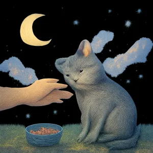 - 고양이가 밥을 먹는 행동: 마음을 조금씩 열고 신뢰가 쌓여가는 긍정적인 변화를 표현합니다.