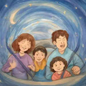 차 안에서는 본인만 안전벨트를 매고 있지만, 부모님과 형제는 안전장치를 하지 않아 위험한 상황과 불안감이 동반된 상태입니다.