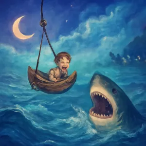 이 꿈은 배, 떨어질 뻔한 순간, 그리고 상어가 강으로 떠밀려와 공격하는 상황이라는 매우 강렬한 상징들을 담고 있습니다.