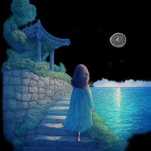돌담 너머로 펼쳐진 빛나는 바다는 마침내 자신의 내면 세계 깊숙이 들어가 안정을 찾고, 새로운 깨달음을 얻는 여정을 상징합니다.