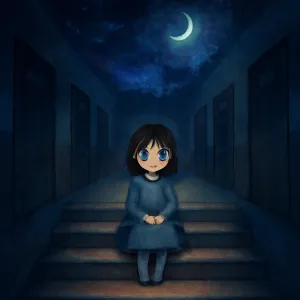어두운 학교 복도는 아직 밝혀지지 않은 자신의 잠재력이나 감정을 의미하며, 계단은 성장과 변화를 암시합니다.