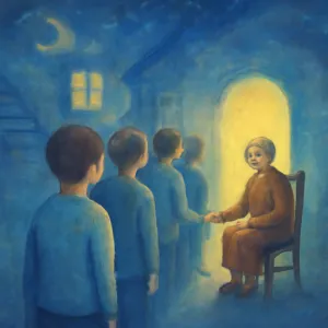 손목을 보는 할머니 혹은 아줌마는 전통적으로 ‘운명’, ‘미래’ 또는 ‘심사’를 상징하며, 손목의 상태를 보고 ‘남거나 나가라’고 말하는 것은 평가, 판단, 또는 운명의 갈림길을 의미할 수 있습니다.