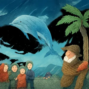 돌고래를 함께 보기 위해 힘든 날씨를 견뎌낸다는 점에서, 어려움 속에서도 공동체 혹은 가족과 함께 희망을 찾아가는 여정, 혹은 내면의 평화와 회복을 상징한다고 해석할 수 있습니다.