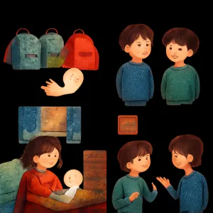 - 책가방(파랑, 초록, 빨강): 가방은 흔히 책무, 책임, 배움의 과정을 나타냅니다.