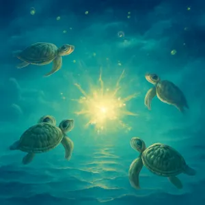 꿈에서 바다거북들이 맑고 아름다운 에메랄드빛 바다에서 주변을 맴돈다는 이미지는 매우 긍정적이고 영적인 상징을 내포하고 있습니다.