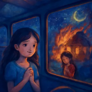 버스라는 인생 여정 속에서 예상치 못한 위험(불)이 다가오고, 소문과 정보의 확산으로 사람들 사이에서 혼란이 벌어진 가운데, 가족과 가까운 사람의 안전에 대한 깊은 걱정을 표현하고 있습니다.