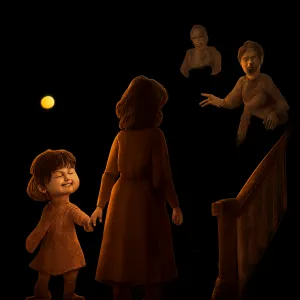 어둡고 주황빛이 감도는 유치원은 미지의 성장 공간이며, 엄마가 사라지고 좀비가 나타나는 상황은 자신만의 힘으로 두려움이나 도전을 극복하겠다는 상징일 수 있습니다.