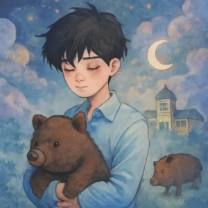 14살 잘생긴 남자 캐릭터는 현실에서도 친구인 인물과 연결되어 있고, 현실과 꿈이 뒤섞인 상태에서 친구와 맷돼지에 관한 상황을 이야기하는 장면이 떠오릅니다.