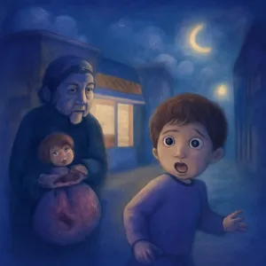 할아버지가 인형과 함께 보자기를 들고 있다는 설정은 종종 과거, 기억, 세대 간의 연결, 믿음 또는 불신을 나타내는데, 여기서는 그 인물이 불안감을 유발하는 미스터리한 존재로서 나타나 심리적 긴장감을 더합니다.