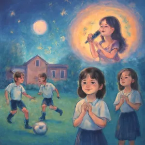 축구하는 친구들이 계속 경기에 몰두하는 반면, 다른 친구들이 노래 감상에 집중한 장면은 각자 자신만의 방식으로 스트레스를 해소하거나 상황을 받아들이는 다양성을 보여줍니다.